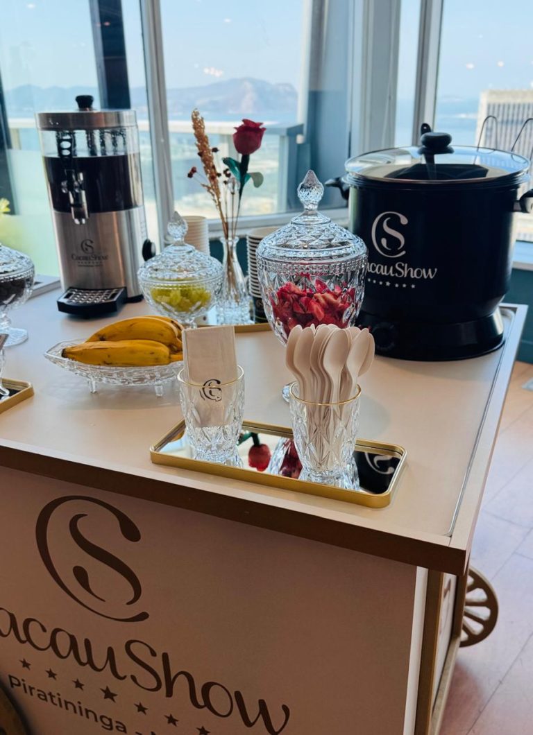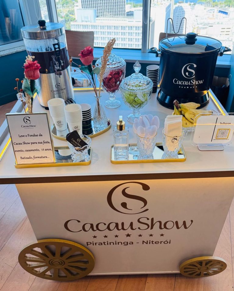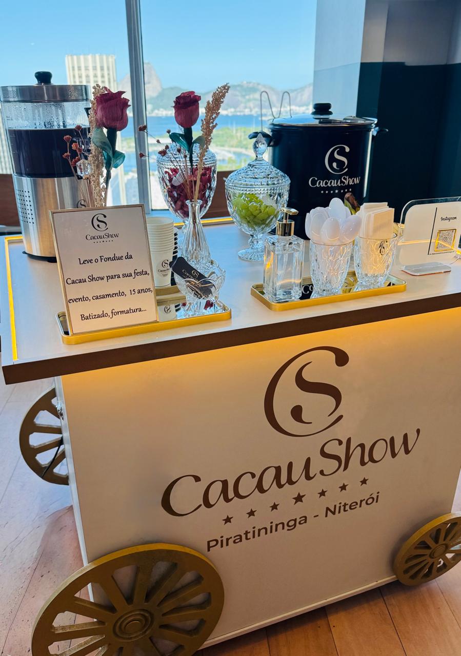 Surpreenda seus convidados com uma experiência sensorial única. Nosso serviço inclui o chocolate premium da Cacau Show derretido na hora, acompanhado de uma seleção de frutas frescas e complementos de alta qualidade. O carrinho é uma atração à parte, decorado para agregar sofisticação ao ambiente.
