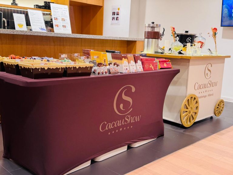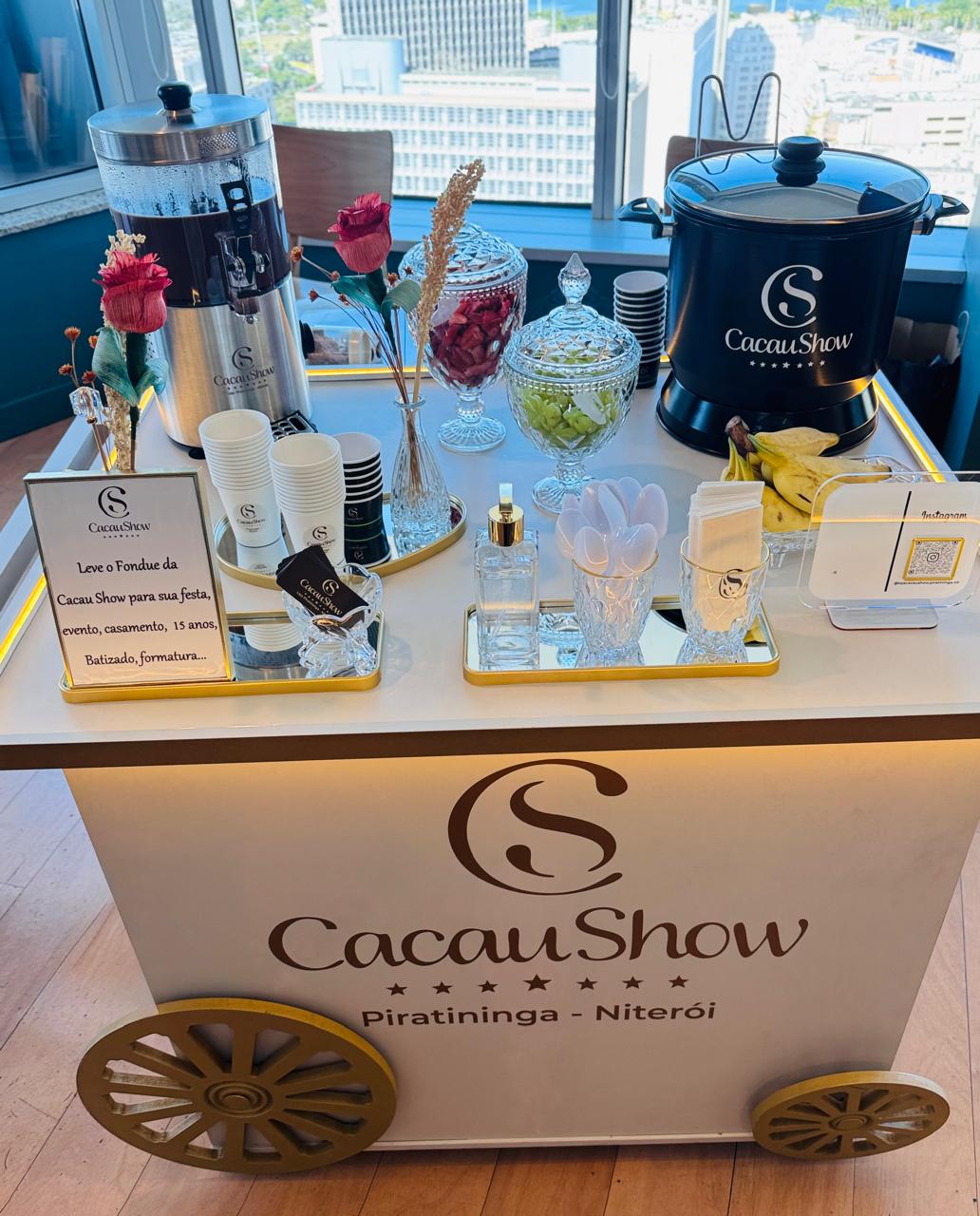 Carrinho temático da Cacau Show com fondue, ideal para casamentos, aniversários e eventos corporativos.