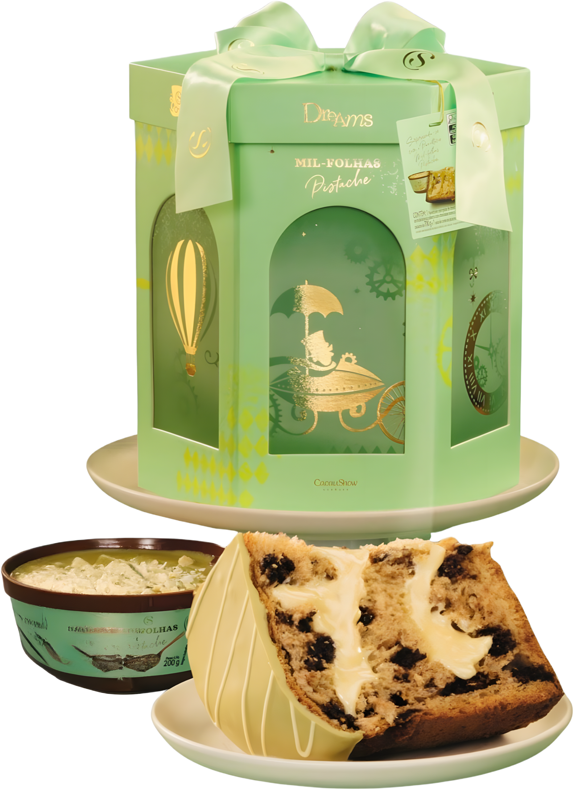 Panetone Dreams Mil-Folhas Pistache tem trufa branca, cobertura branca e fondue de pistache à parte.